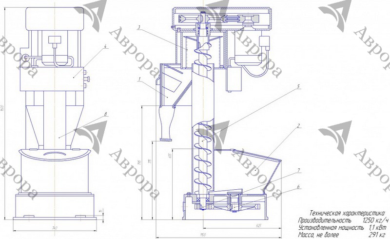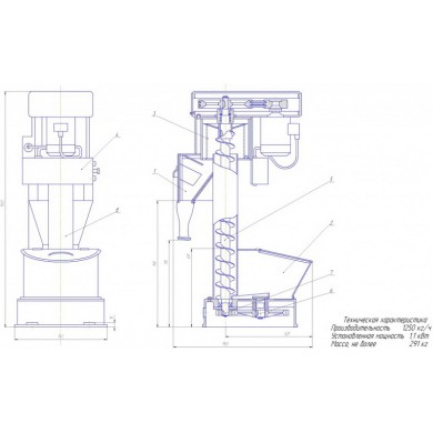 1. Мукопросеиватель П2-П Пионер состоит их приемного бункера 1 с питателем, вертикального шнека 2, просеивающей головки 3, магнитного аппарата 4, шкафа управления 5. 2. Приемный бункер 1 с откидной крышкой 2 установлен на чугунном основании 3. В нижней части бункера 1 находится питатель 8, состоящий из двух спиральных лопастей, которые получают вращение от шнека 10 через зубчатую передачу 5,6. Вертикальная труба 9 соединяет бункер с просеивающей головкой 14. Верхний и нижний конец зафиксирован в подшипниковых опорах 7 и 15. Шнек приводится в движение от электродвигателя 18 при помощи клиноременной передачи 17.Просеивающая головка состоит из корпуса 20, крышки 16, просеивающего барабана 19, сита 13.