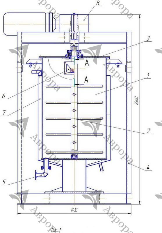 Мельница состоит из камеры измельчения 1 выполненной в виде вертикального цилиндра, внутри которой установлен вал с пальцами 2. Камера измельчения заполняется шариками, приводящимися в движение пальцами вала. Вал приводится во вращение от мотор –редуктора 8. Камера измельчения снабжена теплообменной водяной рубашкой 7, с помощью которой камера измельчения и вал с пальцами прогреваются перед работой, предотвращая застывание продукта при длительных остановках мельницы, и охлаждаются во время работы.